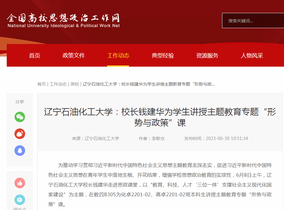 编者按:近日,全国高校思想政治工作网、辽宁日报·北国号等媒体平台对我校校长钱建华走进思政课堂,以“教育、科技、人才‘三位一体’支撑社会主义现代化国家建设”为主题,在教四B305为化卓2201-02、高卓2201-02班本科生讲授主题教育专题“形势与政策”课进行了宣传报道。现将相关报道转载如下: