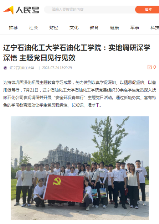 编者按:近日,辽宁日报·北国号、人民日报客户端·人民号等媒体平台对我校石油化工学院组织30余名学生党员深入抚顺石化公司参观调研并开展“安全环保青年行”主题党日活动,通过新颖务实、富有特色的学习教育活动让学生党员强党性、长知识、增才干进行了宣传报道。现将相关报道转载如下: