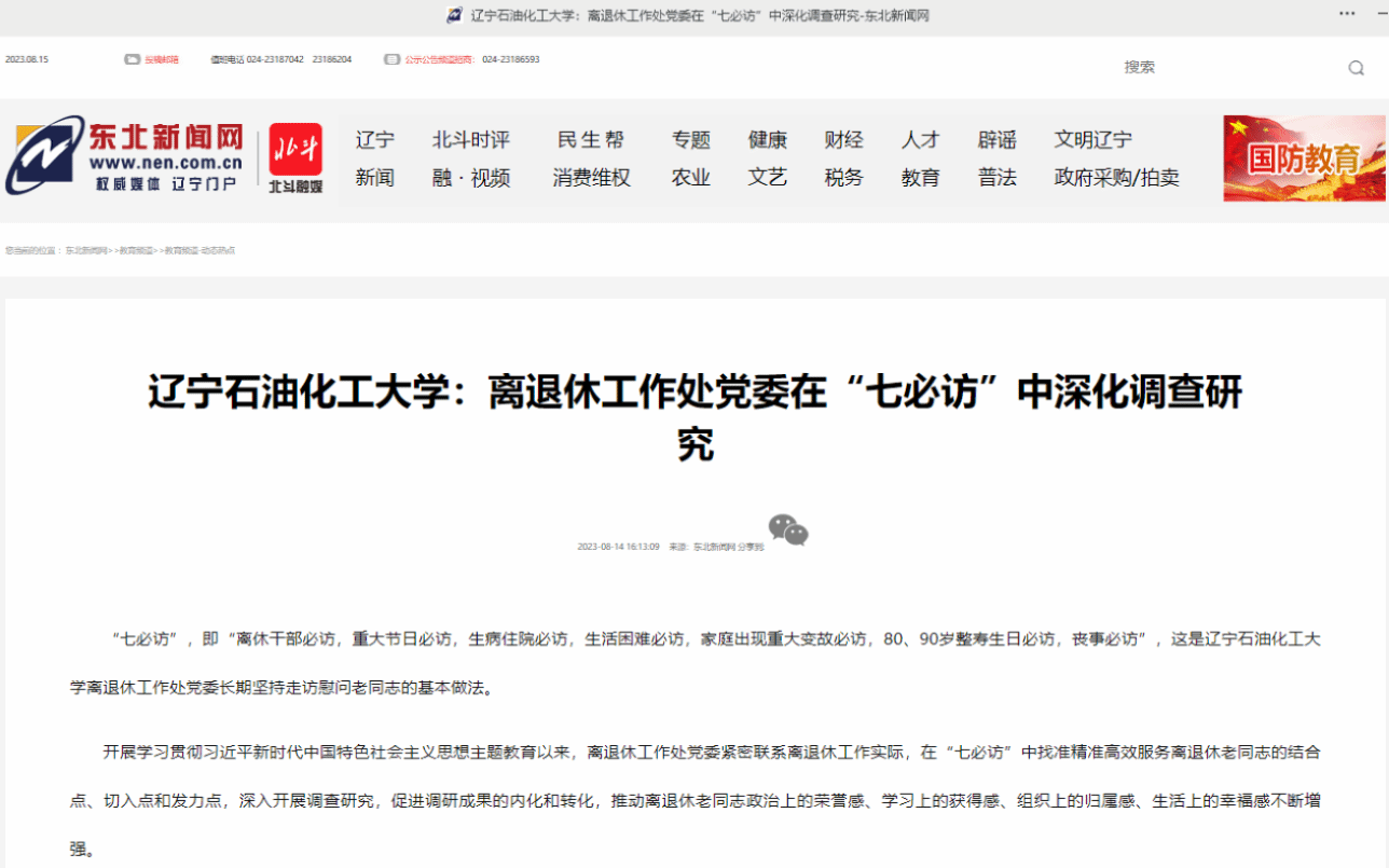 编者按:近日,东北新闻网、辽宁省委老干部局微信公众号、辽宁日报·北国号等媒体平台对我校离退休工作处党委开展主题教育以来,紧密联系离退休工作实际,在“七必访”中找准精准高效服务离退休老同志的结合点、切入点和发力点,深入开展调查研究,促进调研成果的内化和转化,推动离退休老同志政治上的荣誉感、学习上的获得感、组织上的归属感、生活上的幸福感不断增强进行了宣传报道。现将相关报道转载如下: