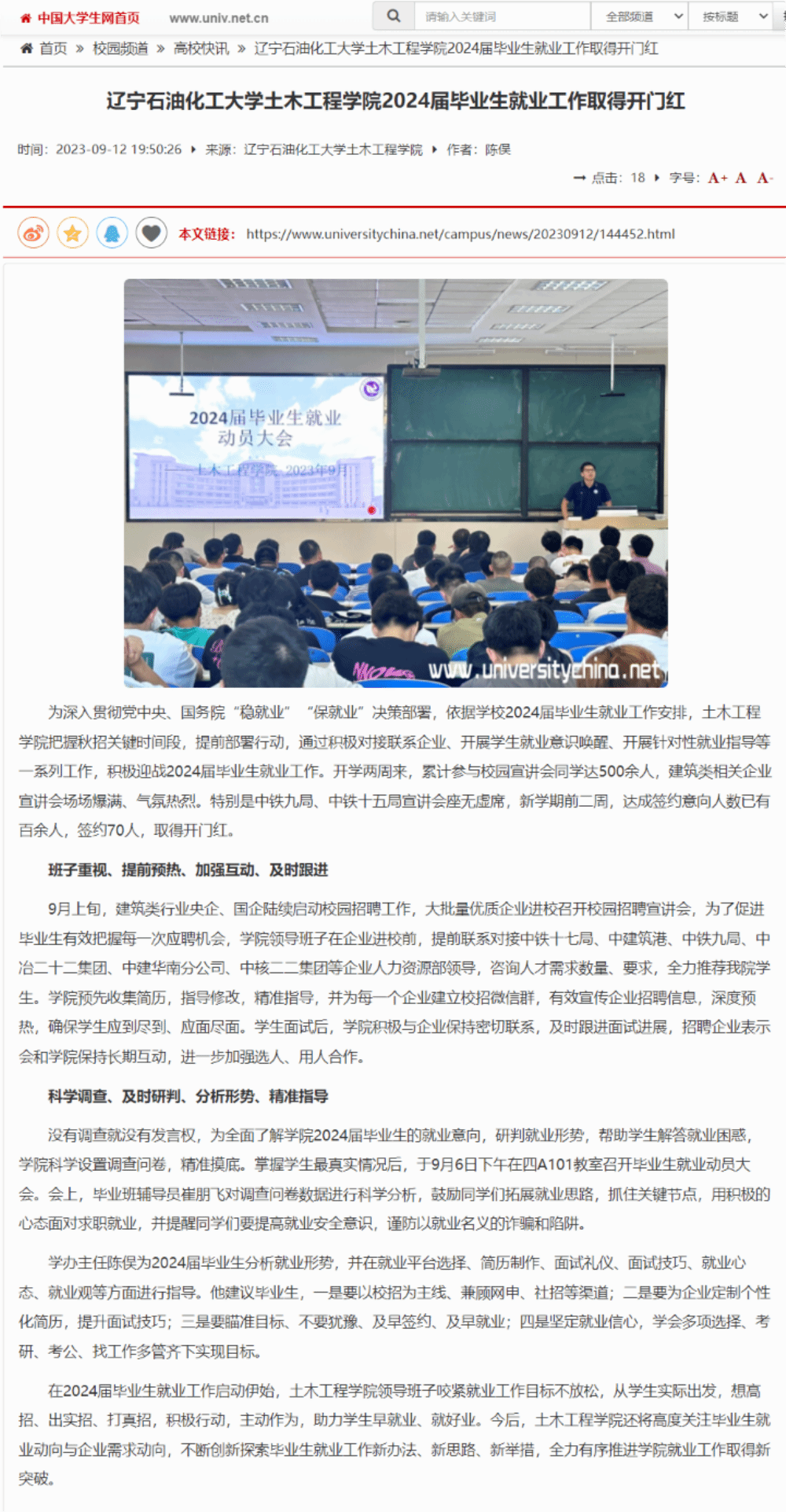 编者按:近日,中国大学生网等媒体平台对我校土木工程学院2024届毕业生就业工作进展取得开门红进行了宣传报道。现将相关报道转载如下: