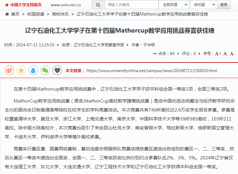 编者按:7月11日,中国大学生网对我校学子在第十四届Mathorcup数学应用挑战赛中获本科组全国一等奖1项,全国三等奖2项进行了宣传报道。现将相关报道转载如下: