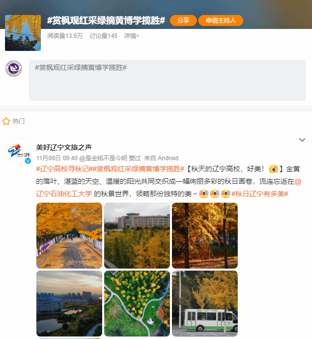 编者按:11月8日,美好辽宁文旅之声官方微博对我校的校园秋色以图集的形式进行了宣传。现将相关报道转载如下: