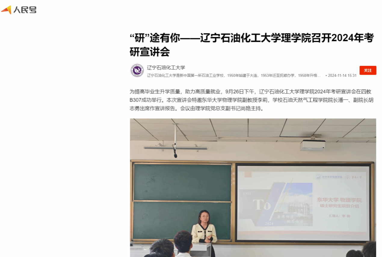 编者按:为提高毕业生升学质量,助力高质量就业,近日,理学院2024年考研宣讲会在四教B307成功举行。人民日报客户端•人民号、辽宁日报•辽望号、搜狐号对此进行了宣传报道。现将相关报道转载如下: